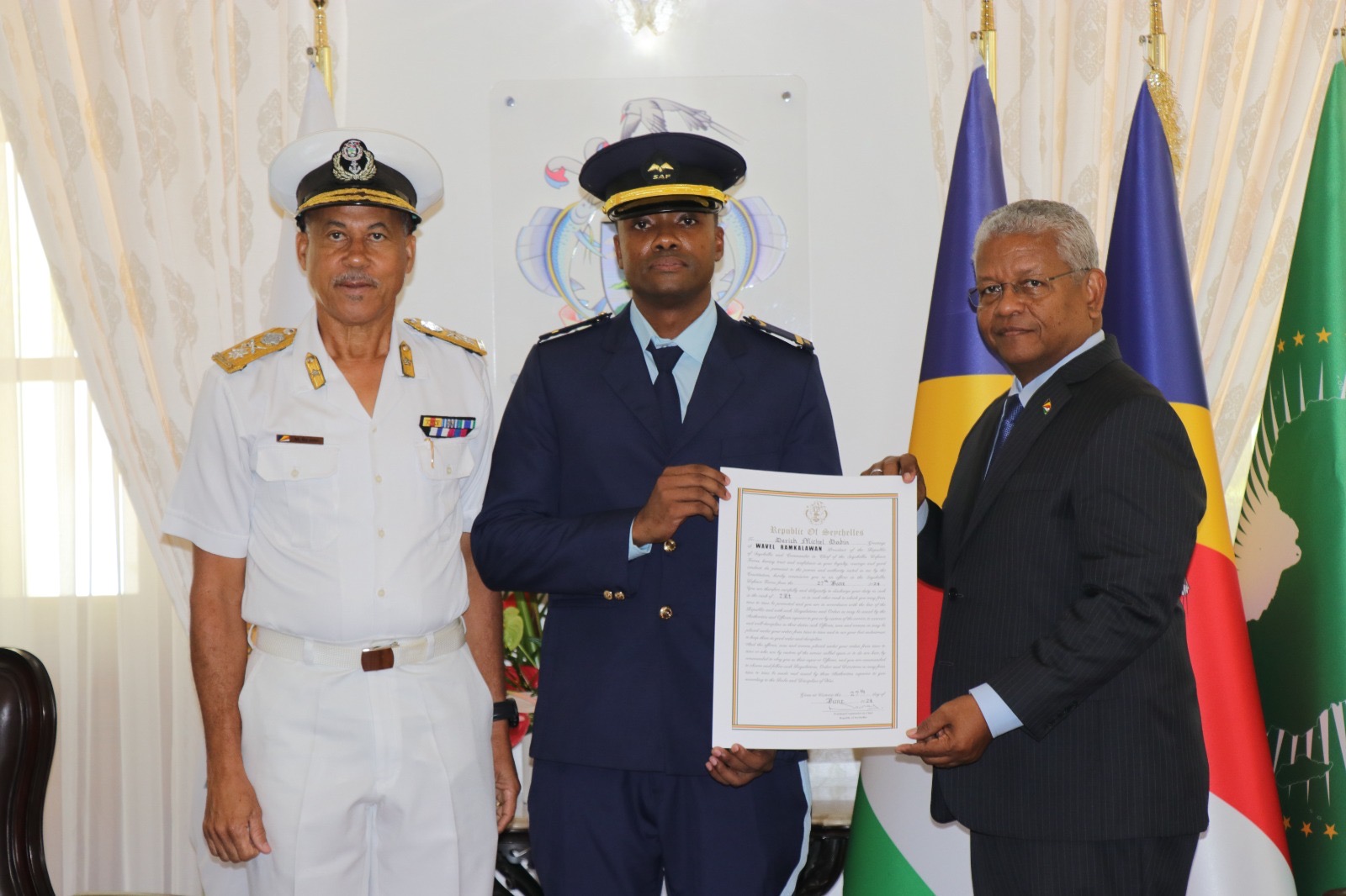 The Commander-in-Chief of the Seychelles Defence Forces,President Wavel Ramkalawan, had the honor of commissioning three newofficers in SDF during a brief ceremony held at State House this morning.