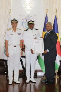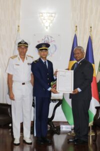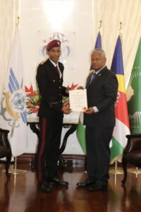 The three officer cadets commissioned to rank of Second Lieutenant were Derick Dodin, a pilot and Anil Burron, anaircraft technician from Seychelles Air Force and Fady Faure a marine mechanic from the Seychelles Coast Guard. Their commissioning follows their successful completion of the officer cadet course from two different institutions namely Indian Naval Academy and the Indian Military Academy.
