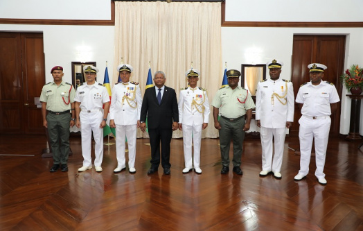 The President of the Republic of Seychelles and Commander-in-Chief of the Armed Forces, Mr. Wavel Ramkalawan, had the honour to appoint and promote six Seychelles Defence Forces officers. This auspicious ceremony was held at the State House this morning.