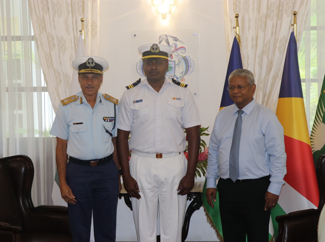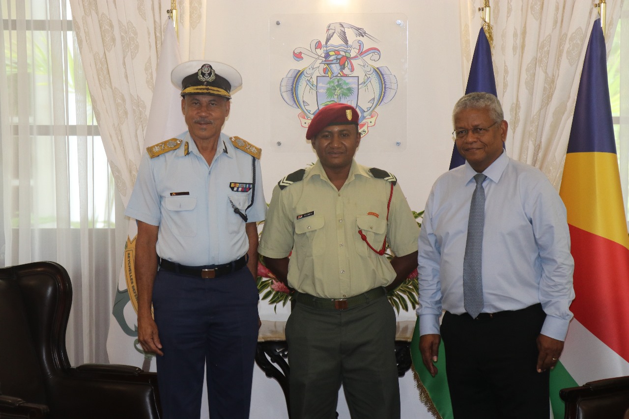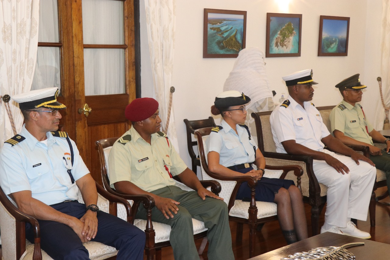 The Commander in Chief, President Wavel Ramkalawan, met with four Military officers who had been deployed overseas for official military duties today at the State House. During the ceremony the President has expressed his gratitude for their notable service and contributions abroad as well as to the Seychelles Defence Forces.