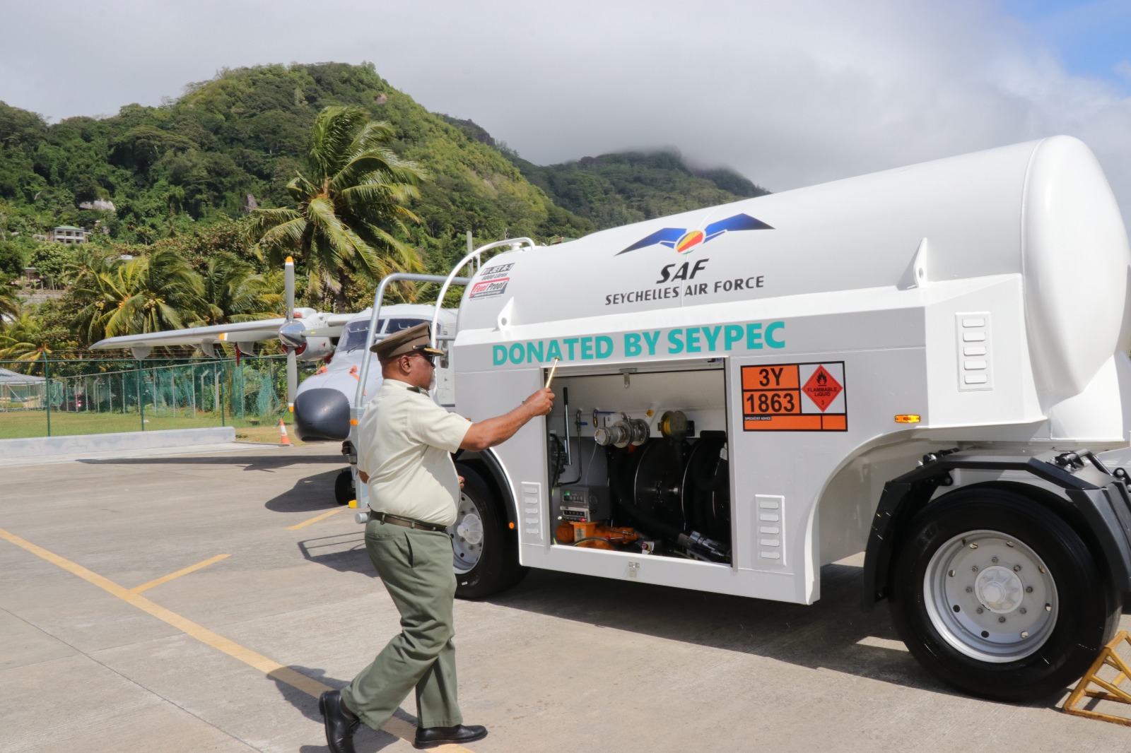 SEYPEC has donated a 6,000-litre  Jet-A1 fuel bowser to the Seychelles Air Force. The event took place this morning at the Seychelles Air ForceBaseat  Pointe Larue, in the presence of the Commander In Chief, Mr. Wavel Ramkalawan, CEO of Seypec, and Senior Seypec and SDF officials.